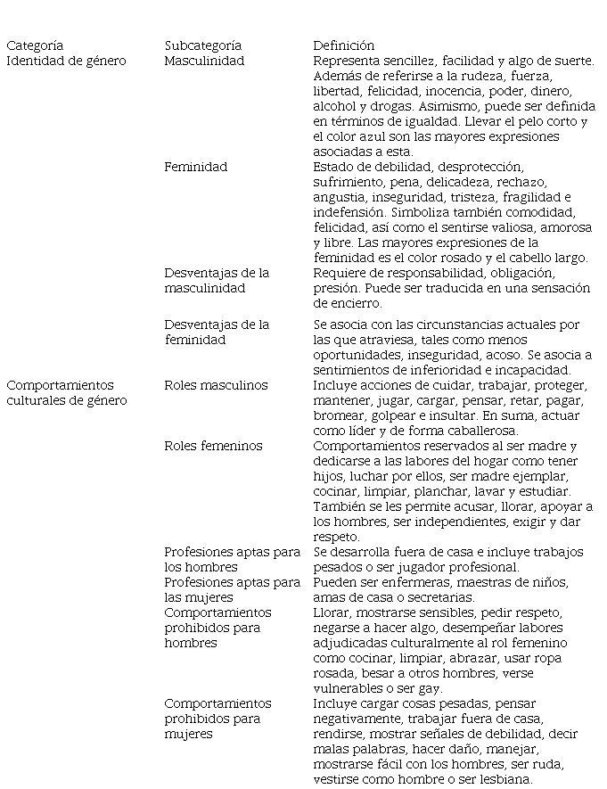 Dentro de esta categoría, el análisis corresponde a la etiqueta con la que se identifican los participantes teniendo en cuenta el sexo con el que nacieron y la forma en la que se sentían y fueron tratados por ser niño o niña. Las experiencias relatadas permitieron definir, en primer lugar, las subcategorías de masculinidad y feminidad, y en segundo lugar, identificar otras dos subcategorías que contienen ciertas desventajas que los participantes señalaron por ser de un género u otro.