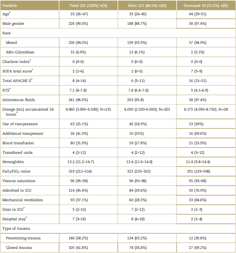 The median age was 33 years (interquartile range (IQR)= 26-47), being higher in patients who died (44 years, IQR = 29-51); 90% were men (n=226). The median Charlson index was 0 (IQR=0-0), SOFA was 2 (IQR = 1-6), being almost 3 times higher in the deceased (7, IRQ = 5-9) and APACHE II of 8 (IQR=4-14), being twice the value in deceased patients (16, IQR = 13-21). In the first 24hours they received 4060 cm3 of intravenous fluids (IQR = 3000-6500). Patients who died received more than 2000 additional cm3. 25.1% of the cohort (n=63) required the use of vasopressors and in 41.3% (n=26) of them a combination of 2 medications was used, 31.9% of the patients were transfused with a higher percentage in patients who died 53.9%. 50% of the patients were transfused with 4 units of blood products, in general venous saturation was 96% without differences between the groups, with a greater percentage in patients who died. 45.4% (n=114) of the participants required admission to intensive care. The median stay in the ICU and hospital stay was 5 days (IQR=2-10) and 7 days (IQR=3-16), respectively. Mortality was 15.5% (n=39). 58.2% (146) of the included patients presented penetrating injuries, 12 (30.8%) of them died and 41.8% (105) patients presented closed trauma, the mortality in this group was 69.2% (Table 1).