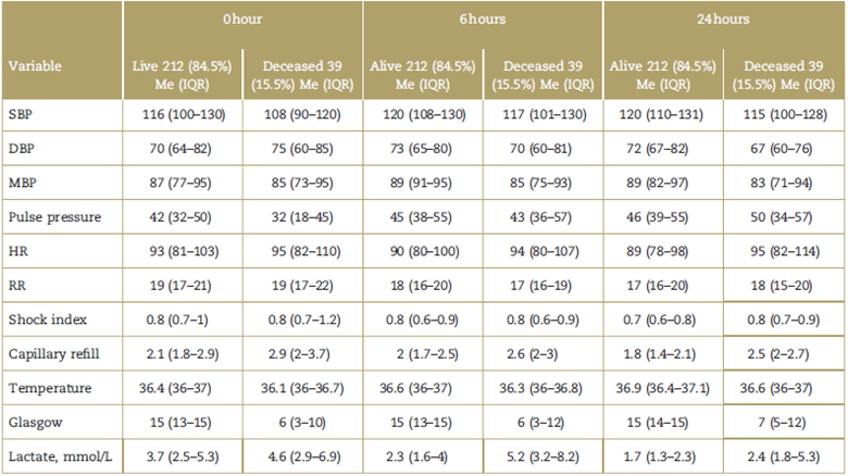 Traumatized patients who died had higher capillary refill values 2.9 seconds, (IQR = 2-3.7) versus 2.1 in those who survived (IQR = 1.8-2.9), as well as lactate values on admission 4.6 mmol (IQR=2.9-6.9) versus 3.7 in those who survived (IQR = 2.5-5.3), the same sequence is maintained for the measurements taken at 6 and 24 hours, as shown in Table 2.