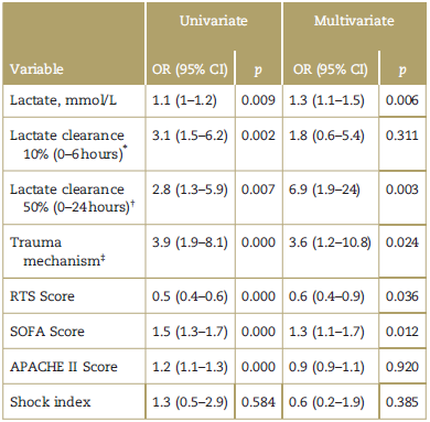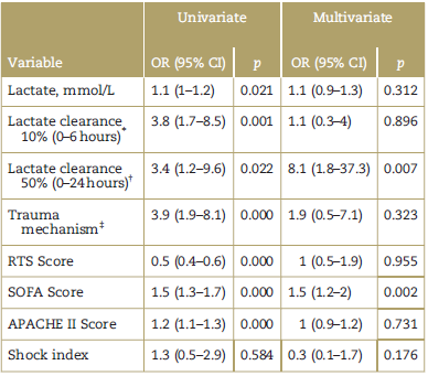 Results: A total of 251 patients met the inclusion criteria, 15.5% died, 45.4% required admission to intensive care, in patients who died the lactate at admission was 4.6mmol/L (Interquartile range = 2.9-6.9). The adjusted logistic regression model showed that lactate on admission, lactate clearance of 50% (0-24hours), trauma mechanism, and Sequential Organ Failure Assessment score were independent factors associated with mortality.