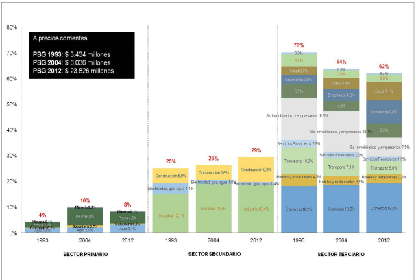 Las últimas estimaciones de PBG disponibles a nivel local incluyen la serie 2004-2012 a precios constantes, así como el año 2012 a precios corrientes (Lacaze et al., 2014). La Figura Nº 1 presenta la estructura productiva local para los tres períodos con estimaciones disponibles a precios corrientes: 1993, 2004 y 2012.