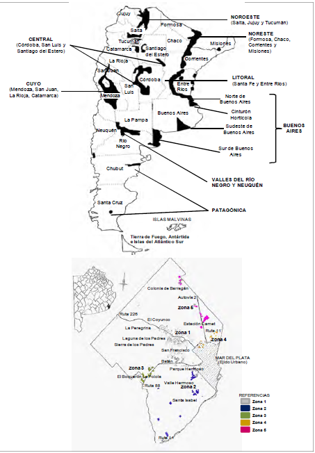 elaboración propia con base en Atucha & Volpato (2002), Wierny (2004) y Lacaze et al. (2014)El cinturón frutihortícola que rodea a la ciudad de Mar del Plata se concentra en las localidades de San Francisco, Laguna de los Padres, San Carlos, Batán y Valle Hermoso, que bordean el ejido urbano de Mar del Plata. Se destacan las aptitudes agroecológicas de la región, en términos de la fertilidad del suelo, las temperaturas moderadas por el clima marítimo con veranos frescos, el volumen y distribución de precipitaciones y la elevada humedad, así como la calidad, diversidad y rendimiento de la producción obtenida. En el panel superior de la Figura Nº 2 se presentan las principales regiones hortícolas de Argentina; en el panel inferior se presenta la provincia de Buenos Aires, destacando en negro a General Pueyrredon y ampliando en detalle las zonas de producción hortícola del partido.