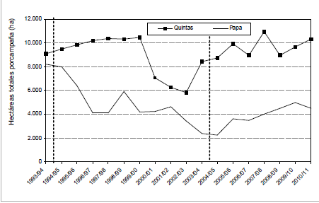La recesión macroeconómica de fines de la década de 1990, el derrumbe del régimen cambiario de convertibilidad a fines de 2001 y la devaluación de principios de 2002 provocaron significativos cambios en los precios relativos de insumos y productos frutihortícolas, tanto por el encarecimiento de los insumos importados y el efecto inflacionario que se trasladó a los de origen nacional, como por las ventas al mercado doméstico en moneda local. Paralelamente, la exportación de los elevados volúmenes de capturas pesqueras se vio favorecida por un tipo de cambio alto. La falta de incentivos vía precio –además– redujo el área sembrada con papa, para incrementar la superficie destinada a otros cultivos extensivos cuya exportación también se vio beneficiada por el nuevo tipo de cambio, fundamentalmente cereales y oleaginosas (tal como se observa en la Figura Nº 3).