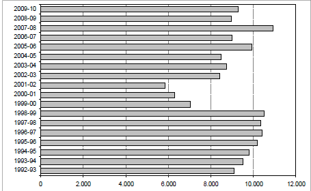Al observar la evolución de la producción total en quintas entre 1992 y 2010 se aprecia cómo creció casi un 130%, pasando de 162 mil toneladas a 360 mil. Siguiendo las variaciones de la superficie sembrada con este tipo de producciones intensivas se puede verificar que en ese período hubo procesos de contracción y expansión. Dos períodos de disminuciones se observan en cuanto a superficie ocupada y consiguientemente en los volúmenes producidos (Gráfico Nº 2). Una aparece a partir del 2001, luego de la caída de la convertibilidad, que implicó un proceso de gran devaluación en el país. La otra se observa entre 2006-2008, coincidente con la Crisis del Campo y que en sector hortícola se manifestó con medidas de fuerza y cortes de ruta, en acompañamiento a otras acciones de protesta que llevó adelante toda la actividad agrícola-ganadera del país, especialmente durante el año 2008.