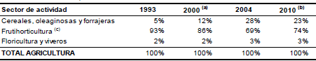 Desde la visión de PBG, aumentos en los coeficientes de CI implican que –para obtener una producción determinada– se requiere un mayor gasto en insumos; y, en consecuencia, se agrega menos valor por peso producido. La reducción del VA por peso producido explica la pérdida de participación relativa de la frutihorticultura local frente a otras actividades del sector primario (Cuadro Nº 1), aun cuando su volumen físico de producción hubiera aumentado.