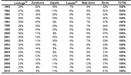 El cultivo de lechuga también se lleva a cabo a campo y bajo cubierta. En el período 2000-2010 el 97% de la superficie total destinada a esta especie y el 96% de la producción obtenida provinieron de la modalidad a campo. Para el caso del tomate, el 45% de la superficie fue implantada bajo cubierta, pero el 70% del volumen total ha sido obtenido bajo esta modalidad de producción.