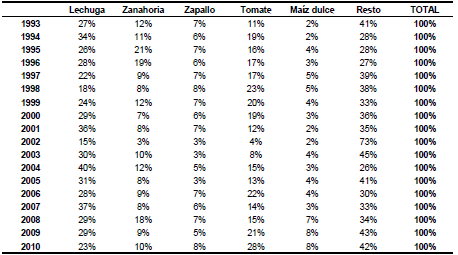El Cuadro Nº 2 muestra la superficie anualmente destinada a cada cultivo de quinta como proporción de la superficie hortícola total. En promedio se destina un 29% de las hectáreas hortícolas sembradas en el partido al cultivo de lechuga; un 14% a zanahoria, 10% a zapallo, 8% a maíz y 5% a tomate, que en la década de 1990 se desarrollaba a campo, pero posteriormente cursó un fuerte desarrollo bajo cubierta.