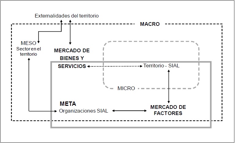 El modelo propuesto permite estudiar de manera articulada las condiciones del territorio, sus recursos, el sistema productivo, el arraigo en la producción, los actores y las dinámicas culturales, económicas, ambientales y sociales de su entorno inmediato (Figura Nº 1). Vincula factores como la política agrícola, las políticas comerciales, los mercados, los vínculos entre los agentes, la institucionalidad, las condiciones de infraestructura, la tecnología y la educación, entre otros elementos condicionantes de la competitividad del SIAL.