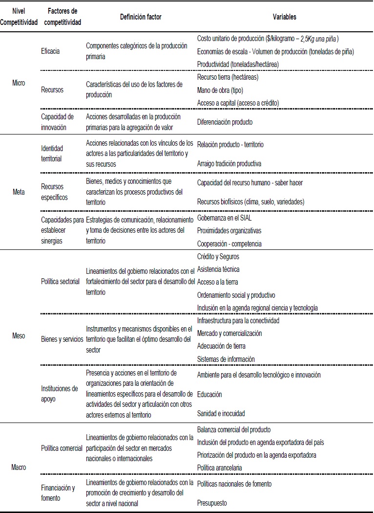 Para el análisis de la competitividad sistémica se definieron como factores aquellos elementos que, relacionados a cada nivel, permiten explicar o definir a través de ciertos indicadores de los procesos sociales, económicos, ambientales y políticos que se dan en el territorio en el que se localiza el SIAL. En la Tabla Nº 1 se describen los factores y variables para cada uno de los niveles de la competitividad sistémica, la cual involucra las características del SIAL.