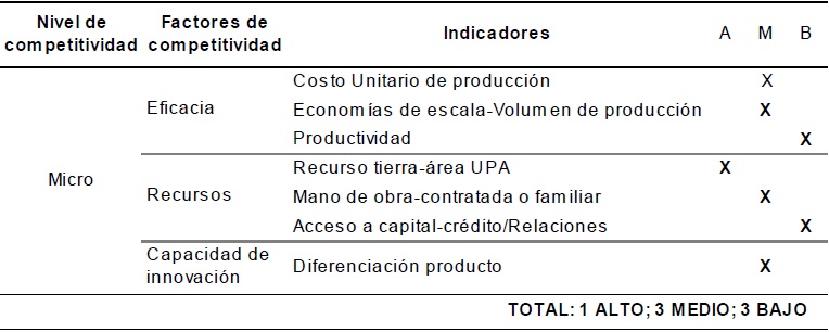 Por consiguiente, los indicadores de la competitividad del SIAL en la producción primaria de piña en el municipio de El Peñón (micro) –anteriormente discutidos– dan cuenta que este nivel se encuentra entre Medio-Bajo (Tabla Nº 2).