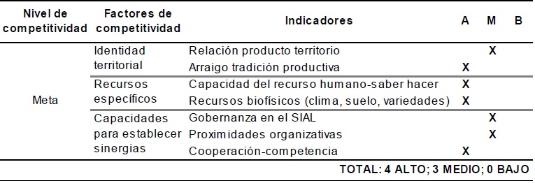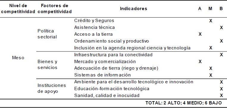 Una vez contrastados los indicadores de acuerdo con el grado de contribución a la competitividad para el ámbito geográfico objeto de estudio se puede afirmar que los niveles meta y macro recogen la mayoría de factores y variables frente a los cuales existen ventajas competitivas y comparativas en relación con los productos y servicios del territorio. Específicamente, deben tenerse en cuenta las condiciones de arraigo, saber-hacer, recursos específicos, reputación territorial, proximidad organizativa, propias de un Sistema Agroalimentario Localizado, los cuales a su vez deben ser potenciados y preservados, mediante el fortalecimiento y mejoras en las condiciones de los mercados de bienes, servicios y factores de producción. A ellos debe sumarse, además, la existencia de circunstancias favorables en términos del rol del Estado en cuanto a las políticas de financiación y de fomento del sector agropecuario.