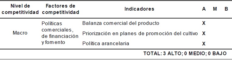 Como resultado de la caracterización anterior se concluye que el nivel macro de la competitividad sistémica del SIAL de la piña en El Peñón es Alto, ya que las estructuras de la economía del país están dispuestas para la comercialización en favor de los productores de piña, dado que las exportaciones tienen limitados aranceles y son muy superiores a las importaciones. Así mismo, el producto se encuentra priorizado en las políticas de fomento nacional (Tabla Nº 5).