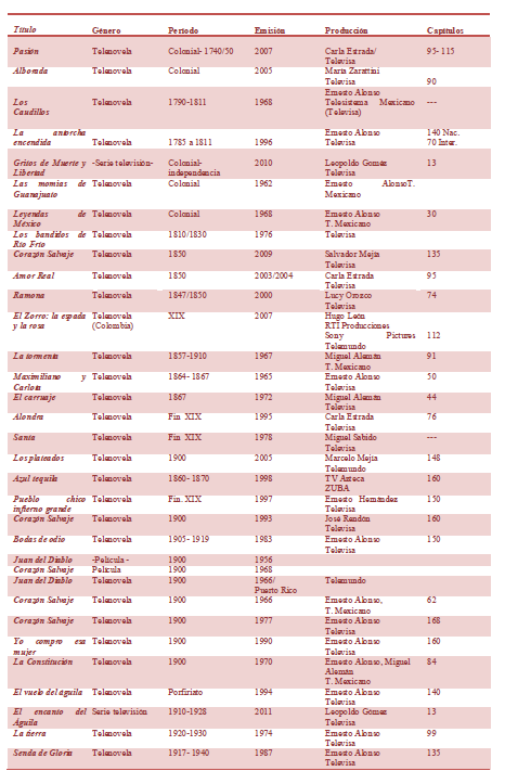 Así pues, delimitados ambos conceptos, no queda más que adentrarnos en la historia mexicana a través de las 33 producciones seleccionadas para este estudio29, y que fueron emitidas en el país entre 1956 y 2011. Para ello, seguiremos el orden cronológico que plantean las historias, puntualizando que, buena parte de ellas pertenecen al modelo de telenovela de época, y por lo tanto, no concretan con exactitud su localización histórica. No obstante, la mayoría, remiten a lo largo de su trama algún hecho, acontecimiento, detalle o personaje histórico que nos ha permitido ubicarlas en un tiempo relativamente acertado.