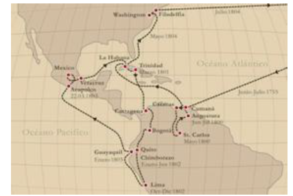 Sin duda, el viaje recreado en el film, aparece como una referencia obligatoria para el estudio de una parte del mundo que incluye la “pequeña Venecia” y que comienza modestamente en Cumaná.9 En su magna obra: Viaje a las regiones equinocciales del nuevo continente (1807), Humboldt evidencia lo visto en sus recorridos por los territorios de Venezuela, Colombia, Ecuador, Perú, México y Cuba, demostrando el alcance de los viajes de exploración y su valor para quienes examinaban el orbe en un sentido amplio y taxonómico (Mapa 1). Su ejemplo encabezaría la larga lista de viajeros que recorrieron el suelo americano, en general, y venezolano, en particular, durante el periodo 1799-1899, al asentar para la posteridad la imagen del viajero europeo ilustrado y constituirse en paradigma de la investigación geográfica moderna.10