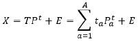 En esta ecuación X es la matriz original de datos de dimensión IxJ, T es la matriz de las muestras (scores) y de dimensión IxA. La matriz P es la llamada matriz de los pesos (loadings) la cual se determina mediante los vectores propios de la matriz de covarianzas de X, tiene dimensión AxJ. Pt es la transpuesta de dicha matriz. E es la matriz de los residuos con dimensión IxJ.