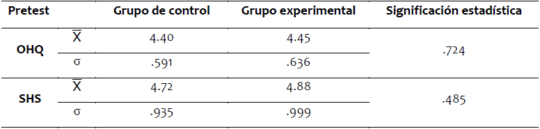 En relación al estudio del primer objetivo, referente a la homogeneidad existente, en el momento del pretest, entre el grupo control y el grupo experimental, respecto a la felicidad de los estudiantes, se pueden observar en la Tabla 1 las medias () y desviaciones típicas (σ) de las variables de la investigación.