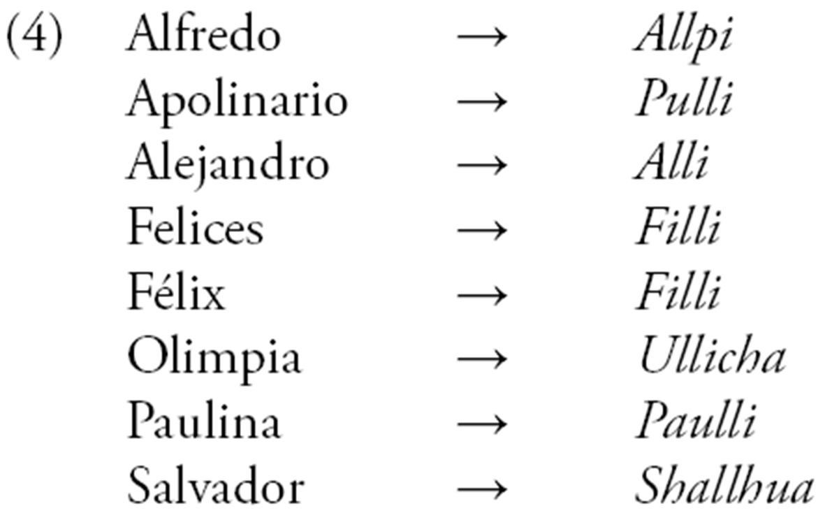 /r/ → /ll/. La vibrante /r/, en fin, deviene igualmente en palatal /ll/ en la formación de hipocorísticos. Conviene recordar, sin embargo, que una vez consumado el cambio *r> l en tiempos preincaicos, el hablante de huanca reaprendió la articulación de dicho segmento, el mismo que sin embargo es reemplazado sistemáticamente por la lateral palatal como recurso expresivo. Los ejemplos que siguen confirman lo que acabamos de señalar: