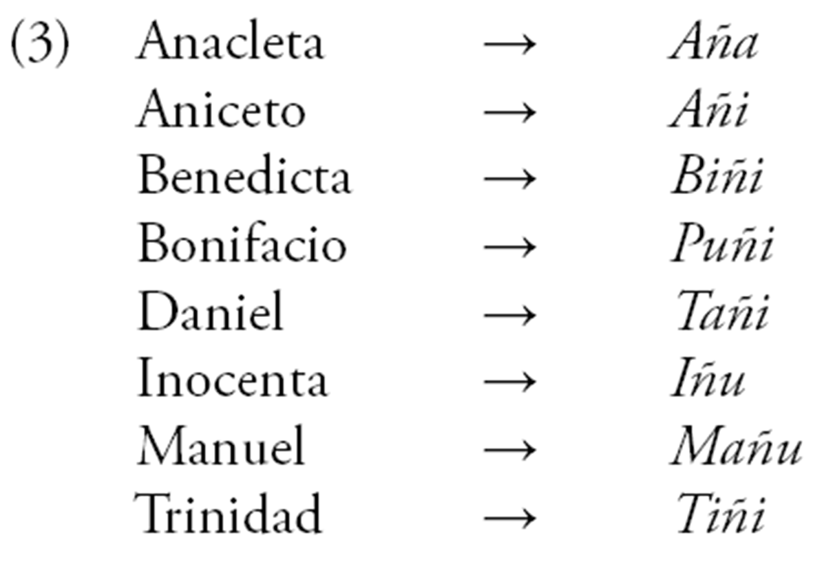 /n/ → [ñ]. La palatal nasal /ñ/, que en términos de ocurrencia dentro del sistema fonológico de la lengua es poco frecuente, adquiere sin embargo un uso exclusivo en la formación de hipocorísticos, sustituyendo a la nasal alveolar /n/.8 Los ejemplos aportados corroboran lo señalado: