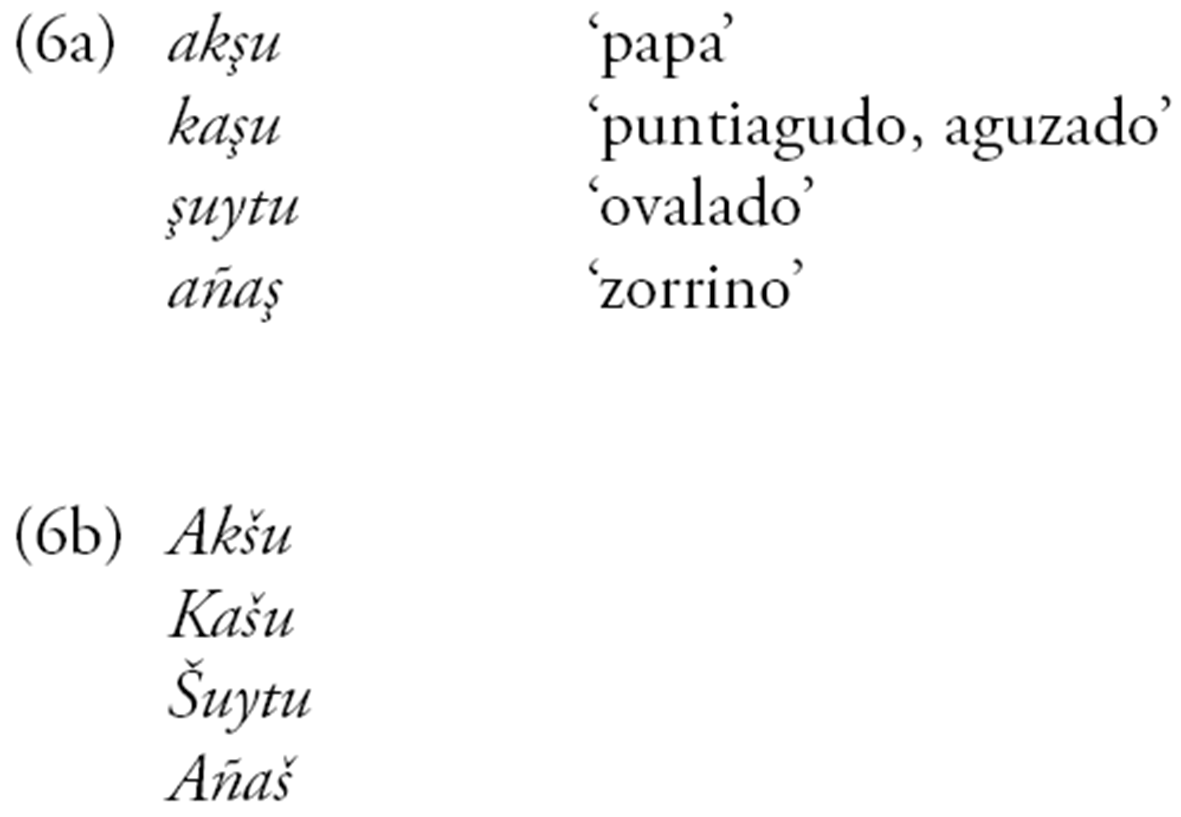 Los apodos, a su turno, son también objeto de tratamiento afectivo en virtud del recurso a la palatalidad; de esta manera, nombres comunes o adjetivos que en el habla común y corriente portan una /ş/ apical cambian dicha consonante por su alófono palatal, es decir /š/ (o sea <sh>). Así, por ejemplo, palabras comunes como las de (6a) devienen en (6b), al ser tomadas como apodos:
