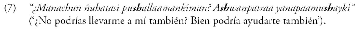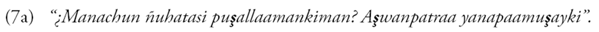 De paso sea dicho, este uso fue caracterizado como “mujeril” por el primer gramático del quechua, a quien no se le escapó la propensión hacia su uso muy frecuente en el habla de las mujeres.5 De hecho, cuando una madre describe los actos de sus hijos pequeños, sobre todo cuando son niños, o cuando ya mayores están enfermos o convalecientes, el empleo del sufijo resulta inevitable por no decir obligatorio.