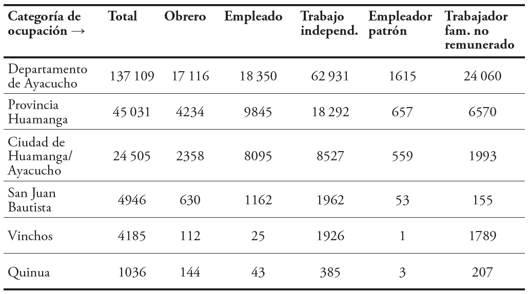 La población económicamente activa (según el censo de 1993) en el Departamento de Ayacucho alcanza 137,109 personas, 45,031 se encuentran en la provincia de Huamanga. La Tabla 1, adaptada de Quispe Alfaro (1995: 25), explica la situación laboral; los trabajadores independientes en sjb son las personas bilingües que hacen viajes regulares al campo por sus negocios y la mayor parte de empleados trabaja en la administración.