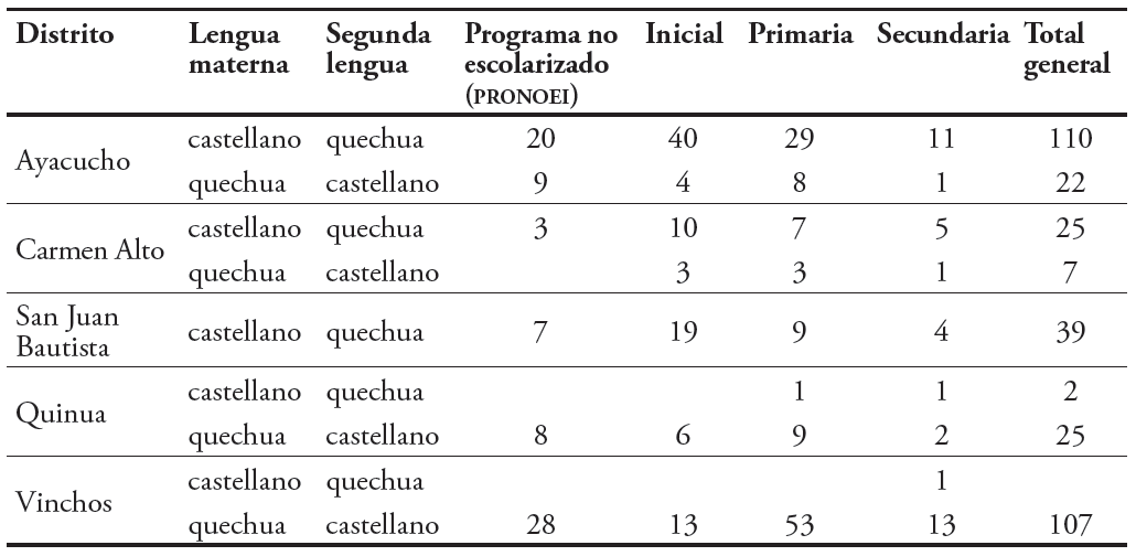 En el Departamento de Ayacucho se hablan tres idiomas indígenas: ashaninka, matsigenka y quechua ayacuchano que pertenecen a dos familias lingüísticas, arawak y quechua, siendo la última la más numerosa. Según el censo de 2007, el 63,9 % tiene quechua como lengua aprendida en la niñez, el 35,7 % castellano. Deducimos de los niveles de educación alcanzados por los quechua nativos (el 38 % primaría, 29,8 % secundaria y 10 % superior) un fuerte proceso de bilingualización hasta el 70 %, pero no sabemos qué grado de competencia y práctica han mantenido en quechua. En el distrito de Huamanga la mitad son quechuahablantes nativos y según nuestra experiencia la mayoría son bilingües con castellano.4 Un 20 % de quechuas nativos son analfabetos. Esto posiblemente se debe a la falta de educación bilingüe, a la pobreza y, además, en las zonas rurales hay una elevada deserción escolar.