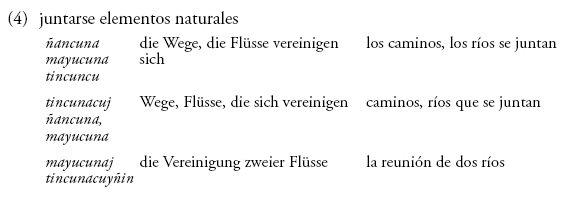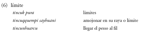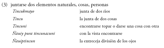 En la junta de elementos naturales –ríos, caminos, límites– tincu- es el lugar concreto de encuentro: dos o varios ríos se encuentran en un lugar. Interesante sería indagar el significado del río resultante. El significado del lugar de encuentro de caminos presenta también desafíos de interpretación. En este sentido tincu- podría ser tanto el lugar donde el camino se bifurca o donde uno de los tramos se encuentra con el otro. Depende de la perspectiva del usuario del camino. En el caso de los límites la situación es también compleja. Cada poblador de una comunidad sabe por transmisión de generación en generación familiar y comunal los límites de su chacra, corrales, pueblo, valle, andenes, etc. El tincu- sería entonces una línea imaginaria de reconocimiento del propio territorio separado de otros.