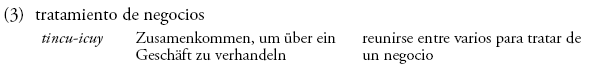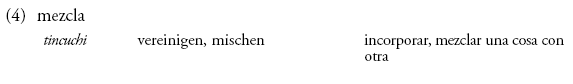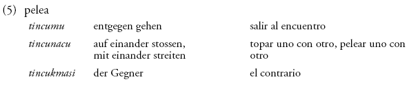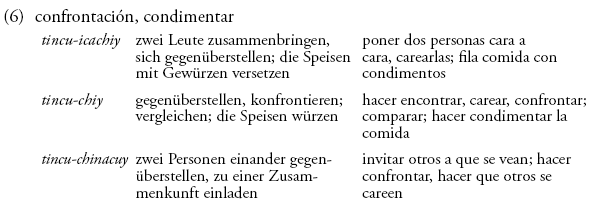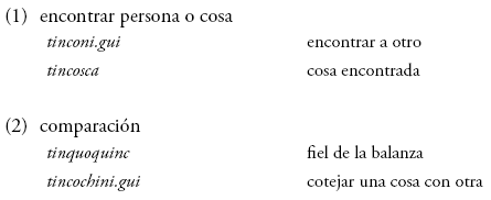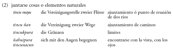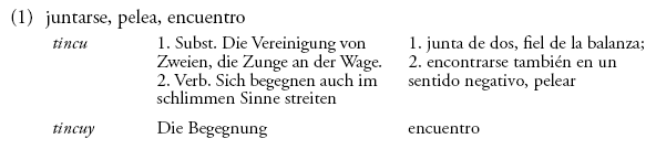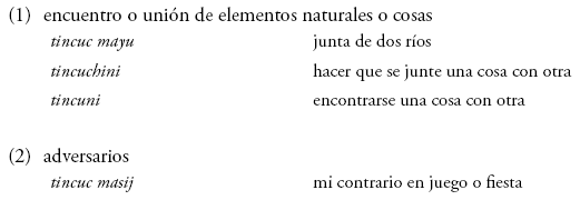 Los vocabularios, a pesar de sus limitaciones, permiten penetrar en la malla cultural a través de diversos significados de tincu- , en los cuales también se destaca ‘encuentro’ entre diferentes que compiten. El acento está en el proceso de la competencia entre contrarios y diferentes y menos en un resultado previsto. Para el siglo XIX es interesante la connotación de ‘negociar’ que agrega Middendorf y que ampliaría o, aún más, precisaría el significado de ‘encuentro’ a un sentido de ‘tratamiento (negociación) entre diferentes’. De otro lado, el autor asocia tincu- con ‘mezcla’ vinculado con la condimentación de la comida. Metafóricamente se puede interpretar mezcla al encuentro, la articulación o coyuntura entre ‘diferentes’ con un efecto imprevisto en el sabor resultante.