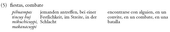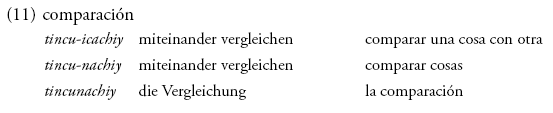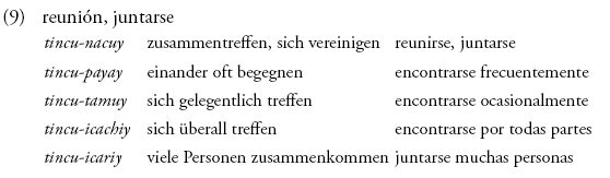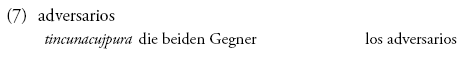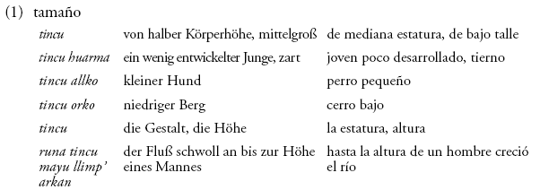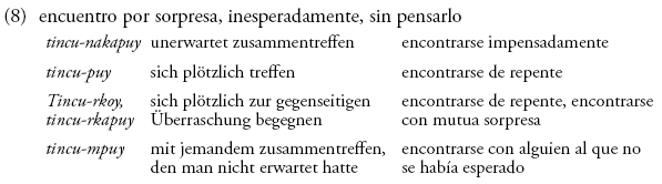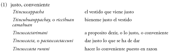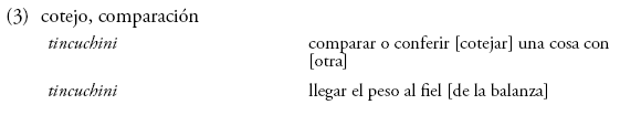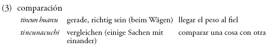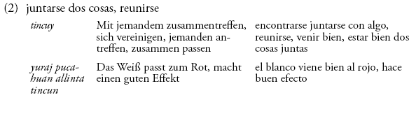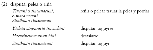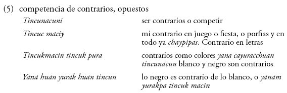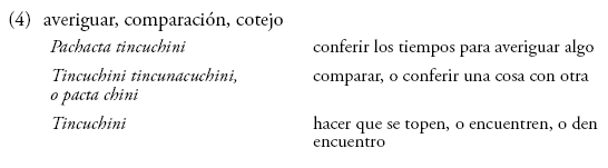 El Anónimo (2014) se ajusta a los cánones de codificación dictadas por el Tercer Concilio Limense (1582-1583) y el uso de la variante del Cusco. El autor amplía el significado de tincu- con ejemplos concretos –la unión de dos ríos–, lo incrementa con el sentido de ‘contrario’ especificándolo en situaciones de juego y fiesta. La idea de competencia entre diferentes es latente. El substrato cultural está más acentuado –se compite entre diferentes– y, por extensión, se entiende el sentido de ‘comparación’ –tincuchini– que literalmente significa ‘hacer encontrar’ cosas, personas, diferentes, para cotejar, comparar.