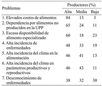 La problemática principal se centró en los elevados costos de producción (84%), la dependencia de alimentos externos (65%), escasa disponibilidad de alimento especializado (60%), alta incidencia de enfermedades (48%) (Cuadro 1). Orona et al. (2014) señala que el bajo nivel de rentabilidad y sostenibilidad se relaciona con deficiencias de manejo nutricional, sanitario, reproductivo y genético de los rebaños.