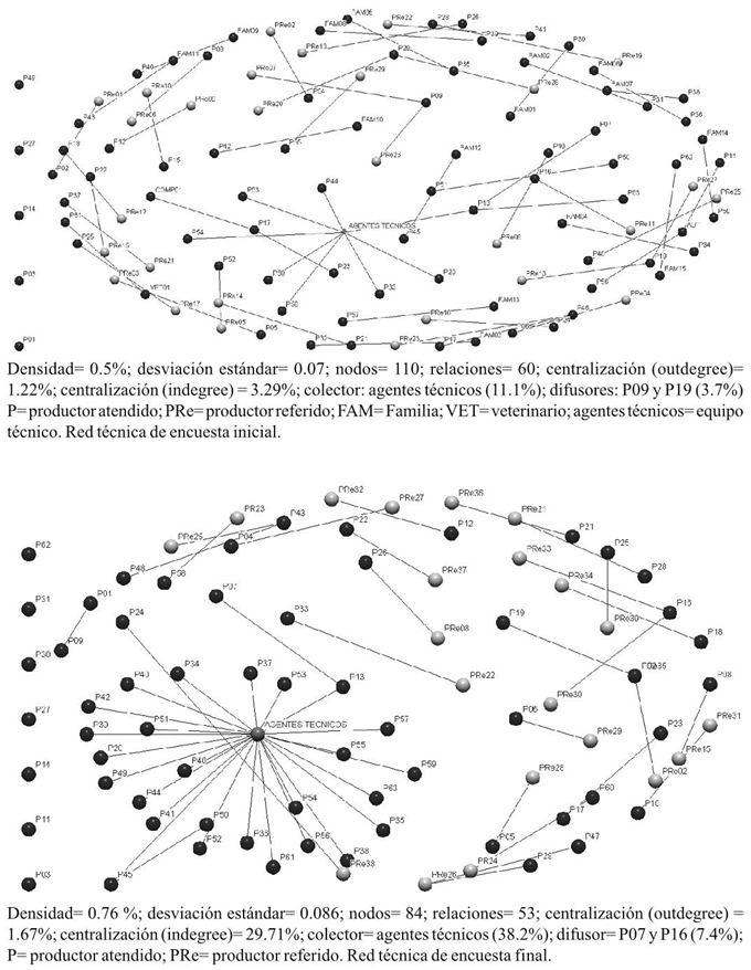 Inicialmente el conocimiento se transmitía entre los productores tras la intervención de los técnicos, el análisis de la red indicó que los técnicos son una fuente de innovación y desarrollo. Los productores P07 y P16 tienen el perfil de difusores (Figura 1). El indicador de centralización inicial fue menor a 4%, y posterior se incrementó a 29.7%, lo cual indica que hubo actores que concentraron las relaciones de aprendizaje (productor 07 y productor 16) (Figura 1). Ello contribuyó a incrementar el INAI de 72.3% en el área de sanidad y prevención y 66.7% en temas de nutrición, las cuales tienen un mayor impacto en el rendimiento.