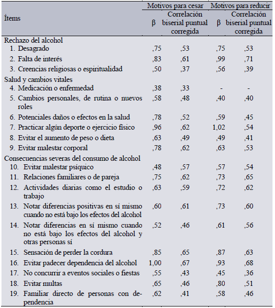 Las cargas factoriales y la correlación puntual biserial corregida fueron adecuadas para todos los ítems; con excepción del ítem por el precio de las bebidas con alcohol, en los motivos para cesar y reducir el consumo de alcohol; y del ítem por ingerir alguna medicación o padecer una enfermedad que me impidiera consumir alcohol, en los motivos para reducir. Estos ítems fueron descartados de la escala final según el caso. También se detectó la presencia de un caso Heywood (ítems con comunalidades iguales a 1) encada escala (tabla 1).