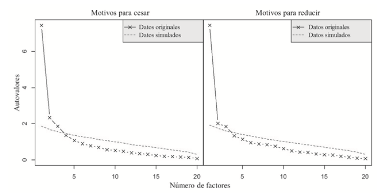 La medida de adecuación KMO y la prueba de esfericidad de Bartlett fueron satisfactorias para los motivos para cesar (KMO = 0,84, prueba de esfericidad de Bartlett = ,01) y para reducir (KMO = 0,83, prueba de esfericidad de Bartlett = ,01) el consumo de alcohol. La valoración de los autovalores mediante el análisis paralelo, indicó que la mejor solución era la de tres factores, tanto para cesar como para reducir el consumo de alcohol (figura 1).
