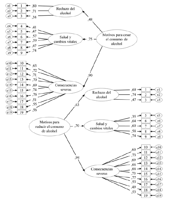 El análisis factorial confirmatorio en la segunda mitad de la muestra presentó índices satisfactorios en la escala de motivos para cesar el consumo de alcohol, χ2= 1146,42, gl = 14, p < ,05, CFI= 0,92,TLI= 0,91, RMSEA= 0,07, SRMR= 0,07,y óptimos en la escala de motivos para reducirlo, χ2 = 1118,25, gl = 153, p < ,05,CFI = 0,96, TLI = 0,95, RMSEA = 0,04,SRMR = 0,05. Los coeficientes estandarizados de cada ítem y de las dimensiones respecto de la escala total, se encuentran en la figura 2.