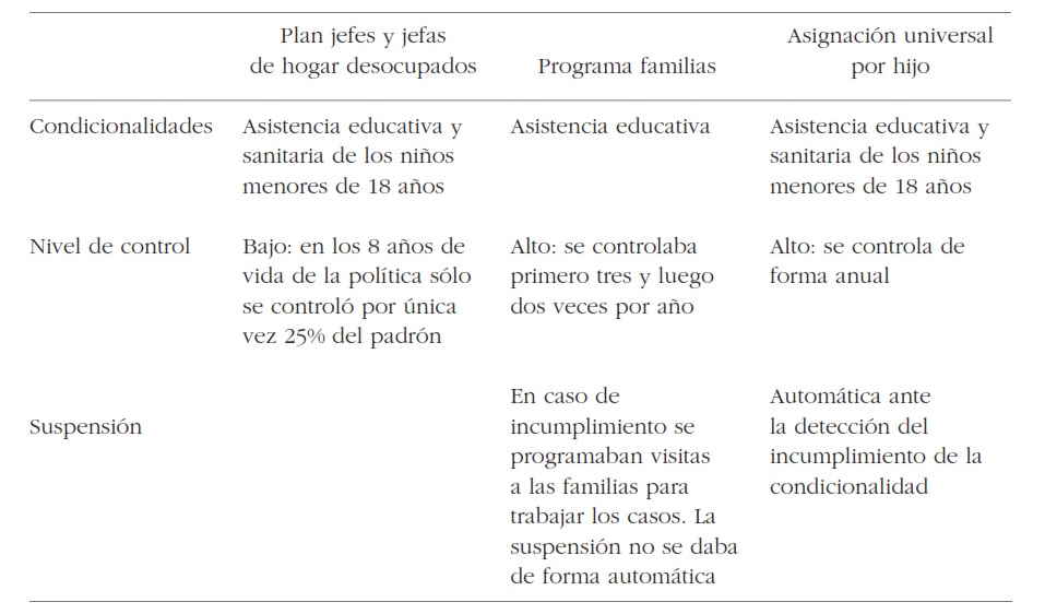 Las dos políticas que la AUH reemplaza contaban con condicionalidades. De una investigación anterior14 surge que el Plan jefes y jefas de hogar desocupados, antes introducido, utilizaba la exigencia de presentar el certificado de alumno regular con el objetivo principal de lograr una correcta focalización de la política. La presentación de dicho certificado, que es confeccionado por las escuelas una sola vez por año, permitía asegurar que el adulto que lo presentaba estuviera a cargo de los hijos, y que no se hubiera inscrito en otra política similar. En el Plan jefes y jefas de hogar desocupados no existía una certificación sistemática de las condicionalidades debido a, por un lado, que la política no tenía como objetivo principal fomentar la salud y la educación de los niños, niñas y adolescentes y, por el otro, a la baja capacidad operativa en un contexto (2002) donde la informática aún no se encontraba ni tan desarrollada ni tan extendida.
