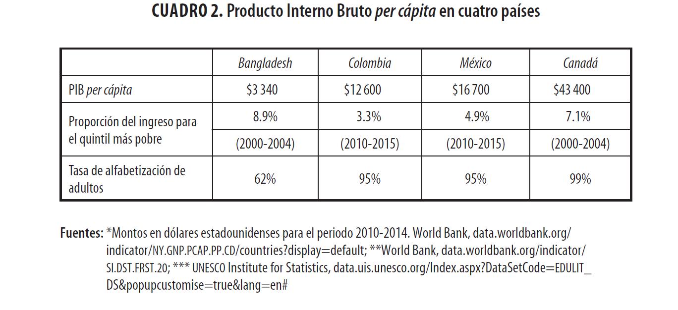 En el cuadro, el Producto Interno Bruto (PIB) es un índice muy grueso de cuánta riqueza y recursos hay disponibles por persona en un país específico (las cifras se presentan en dólares internacionales actuales). La línea siguiente ofrece estimaciones gruesas de la proporción de tal riqueza nacional disponible y utilizable para el 20% más pobre y, como tal, funciona como indicador de la desigualdad en la distribución del ingreso en cada país. Obviamente, en los tres países las familias pobres y sus niños son mucho más pobres que la gente en una categoría de ingreso similar en un país como Canadá, pero existen diferencias importantes. A Bangladesh se le considera, por lo general, como una de las naciones más pobres en el mundo, y ser pobre ahí es muy diferente de ser pobre en naciones como Colombia y México, considerados típicamente como naciones de ingreso medio-alto en el mundo. Esto no quiere decir que la pobreza en Colombia o México sea necesariamente una condición menos difícil o desesperada que la pobreza en Bangladesh, pero tampoco se le puede considerar igual. Debemos también destacar que los tres países cuentan con tradiciones centenarias de pensamiento e investigación, que han contribuido de forma importante a cómo entendemos el mundo y nuestro lugar en él.