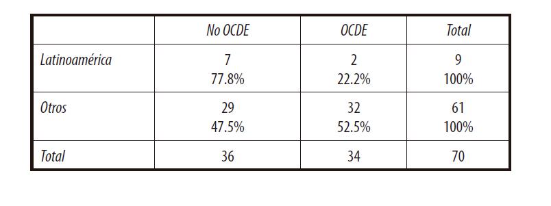 Al hacer estas comparaciones es importante notar que, entre los países de los que se cuenta con datos, 2 de los 9 de Latinoamérica son miembros de la OCDE, mientras que 32 de los 61 que no son latinoamericanos, son miembros de esta organización. Es decir, existe una proporción importante de países miembros de la OCDE contra los que han sido comparados los países latinoamericanos y que se caracterizan por ser naciones desarrolladas. El cuadro 1 muestra la distribución de la muestra que será empleada para dichas comparaciones: