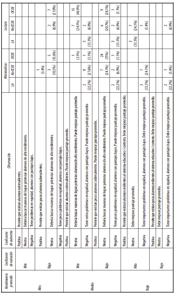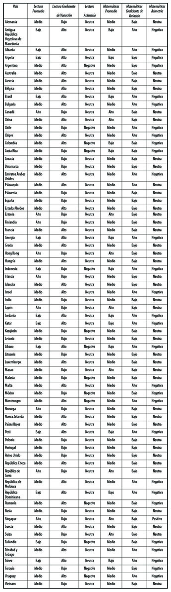 A partir de dicho cuadro, es posible advertir la existencia de diferencias características de los países latinoamericanos con el resto de los evaluados. Estos países parecían distribuirse en la parte inferior del cuadro, mientras que los países de la OCDE se encontraban distribuidos en la parte superior y el resto de los países, que no eran latinoamericanos o de la OCDE, se distribuían a lo largo de todo el cuadro. Destaca también que los países latinoamericanos eran caracterizados con asimetría negativa y con coeficientes de variación, en su mayoría, altos. Así pues, los resultados educativos de Latinoamérica refrendan la existencia de una dificultad por alcanzar la calidad de los resultados educativos tanto si se entiende la calidad como eficacia, como si se la entiende en términos de equidad.