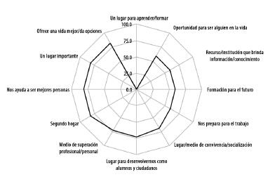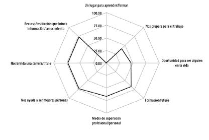 En la categoría escuela y vínculo con el futuro se agruparon los descriptores: formación para el futuro, nos ayuda a seguir adelante, permite continuar con la vida académica, nos brinda una carrera/título, nos prepara para el trabajo, un lugar donde forjar la vida que queremos y oportunidad para ser alguien en la vida. El conjunto de dichos descriptores tiene en común valorar a la escuela como una entidad que facilitará opciones para el futuro y mejora de las condiciones de vida.