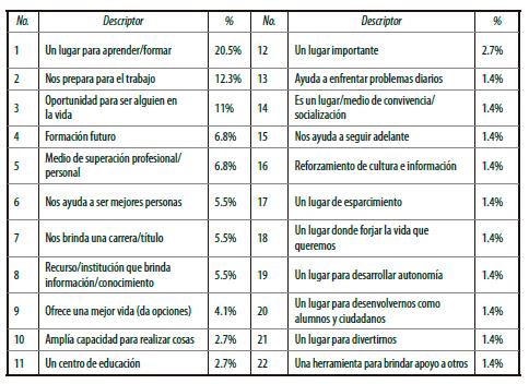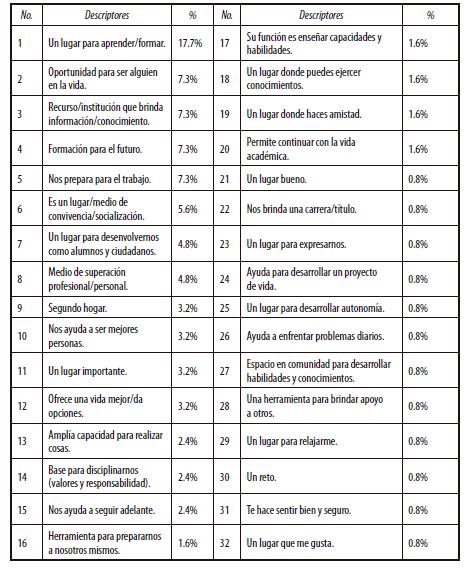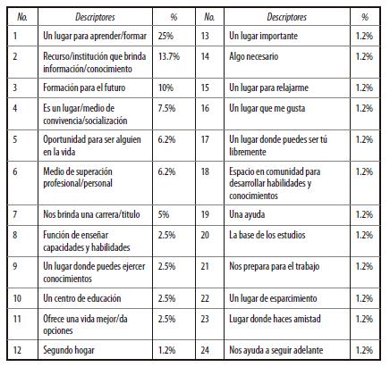 La gran mayoría de los descriptores que utilizaron los tres grupos de estudiantes fueron compartidos; sin embargo, se identificaron descriptores propios en cada grupo. En el caso de los referidos por los estudiantes de alto rendimiento, se destacan: ayuda para desarrollar un proyecto de vida, base para disciplinarnos, herramienta para prepararnos a nosotros mismos, permite continuar con la vida académica, te hace sentir bien y seguro, un lugar bueno, un lugar para expresarnos, un reto. Por su parte, en las respuestas de los estudiantes en riesgo se identificaron los descriptores: algo necesario, la base de los estudios, un lugar donde puedes ser tú libremente y una ayuda. Por último, en las respuestas de estudiantes de reingreso se encontraron los descriptores: reforzamiento de cultura e información, un lugar donde forjar la vida que queremos y un lugar para divertirnos.