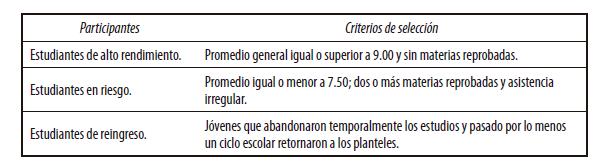 Las muestras fueron no probabilísticas y se optó por un muestreo deliberado. Para la selección de estudiantes en cada plantel se solicitó a las autoridades organizar grupos que cumplieran con los atributos descritos en el cuadro 1.