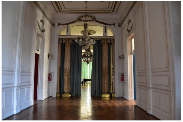 En sintonía con esta lógica, en 1998, se inició la restauración del edificio del Tigre Club (1912), que posteriormente daría alberge al Museo de Arte de Tigre (MAT); este último, no obstante -y debido, en parte, a la crisis económica que había atravesado el país-, recién abrió sus puertas en 2006. La entidad patrimonial, ubicada en el casco histórico de la ciudad, se encuentra al final del paseo Victorica. Se trata de un edificio de dos plantas, de principios del siglo XX, con preponderante arquitectura neoclásica y rodeado de un amplio espacio verde. La planta baja del edificio cuenta con dos grandes salas centrales y otras más pequeñas34 que se comunican, por medio de una amplia escalera, con el primer piso. Este posee una sala expositiva y de reunión de importantes dimensiones -antiguo salón de baile- con pequeños recintos a sus lados que culminan, en el otro extremo, en una pasarela con doble columnata y terraza a orillas del río Lujan.35 El museo brinda, tanto en su interior como en su exterior, no solo exposiciones con visitas guiadas, sino también talleres y cursos, actividades lúdicas y educativas, encuentros, conciertos y eventos masivos (figuras 1 y 2).