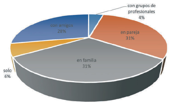En otro orden, dado que nos enfocamos en los visitantes de los fines de semana, en cuanto a los contextos en que se encuentran dichos visitantes, se acentúa, particularmente, la presencia de público familiar -un 62% del total, conformado por 31% de familias con diferentes estructuras y edades, y un 31% de parejas-. Quedan, por detrás, las visitas con amigos -el 28%-, las de individuos que asisten solos -un 8%-, y las de grupos integrados por profesionales -que constituyen el 4%-. Estamos ante un conjunto de visitantes que busca con claridad una experiencia compartida, social y alejada de la cotidianidad. En este sentido, es sustancial distinguir las ofertas de la ciudad y del MAT para asistir a estos tipos de visitantes. Esta zona de Tigre, que se extiende a lo largo de la costa, brinda la conjunción del espacio verde con propuestas recreativas y de consumo que se complementan, a su vez, con la invitación a visitar la sede museal. Esta entidad brinda, durante los fines de semana, talleres de plástica para niños, visitas guiadas y una variada oferta expositiva, a manera de amalgama entre el entretenimiento y lo educativo. Ambas condiciones, podemos considerar que concentran las preferencias de estos micropúblicos; ofertas que permitan divertirse y enriquecerse con la transmisión de conocimiento.