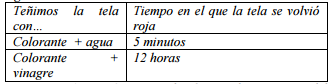 Actividad 1: Boris quiere teñir una remera de tela blanca con colorante rojo. Le pidió ayuda a su amiga Clarita para averiguar si es conveniente usar agua o vinagre para disolver el colorante rápidamente. Ambos trabajaron toda la tarde y obtuvieron los resultados mostrados en la siguiente tabla :