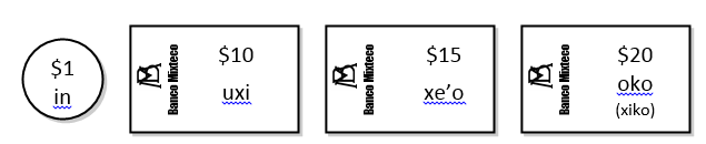 En relación con las herramientas, la propuesta incluye una que se denomina dinerito ñuu savi (ver Figura 2), de la cual se espera que cumpla diversas funciones. Por una parte, se utiliza en actividades que tienen como fin apoyar el reconocimiento y uso fácil de las bases aditivas y base multiplicativa de la numeración tu’un savi, para expresar cantidades (Tema II). Por ejemplo, en una de esas actividades se le pide a los niños que exploren diferentes formas en las que se puede reunir una cierta cantidad de dinero, sin excederse. Después se le pide a los niños que determinen y justifiquen cuál es la forma más práctica (o económica) de reunir la cantidad, procurando que reconozcan que ésta coincide con cómo se nombra al número en tu’un savi.