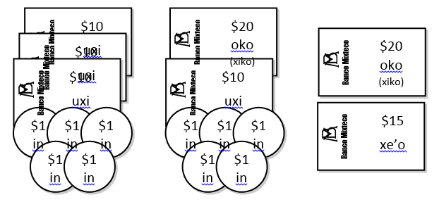 En la Figura 3 se muestra el caso de completar la cantidad de 35 pesos. Como se puede notar, la forma más práctica es la tercera, la cual coincide con cómo se expresa el número en tu’un savi: oko xe’o (ver Tabla 2).