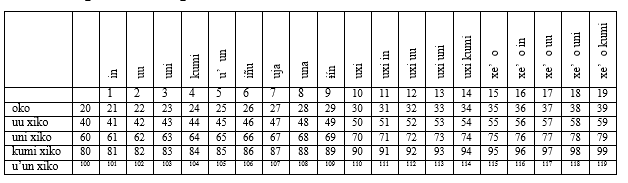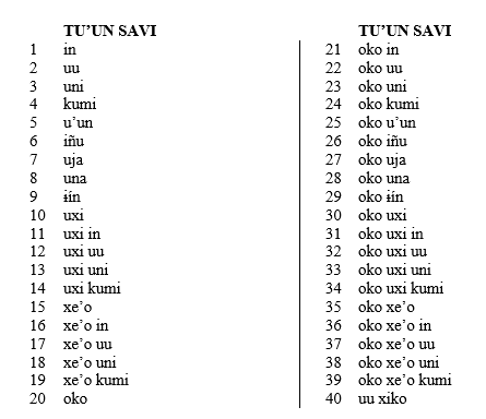 En los análisis que realizamos, el primer paso consiste en escribir los números en la lengua hasta el 100, asociando cada uno con el numeral indo-arábigo que le corresponde. En la Tabla 1 se ejemplifica el caso del tu’un savi hasta el 40.