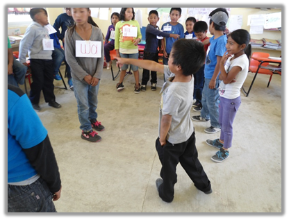 En una primera versión, el docente dice “in” (1) y un alumno debe responder “uu” (2), el docente dice entonces “uni” (3) y otro alumno responde “kumi” (4), finalmente, el docente dice “u’un” (5) . En otra versión, el docente va a señalando a diferentes niños para que vayan pronunciando cada número en la secuencia.