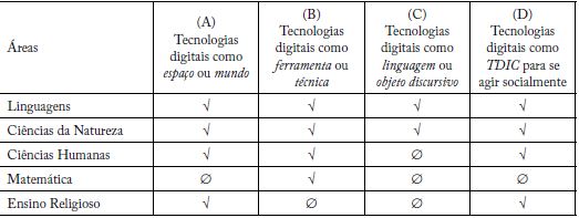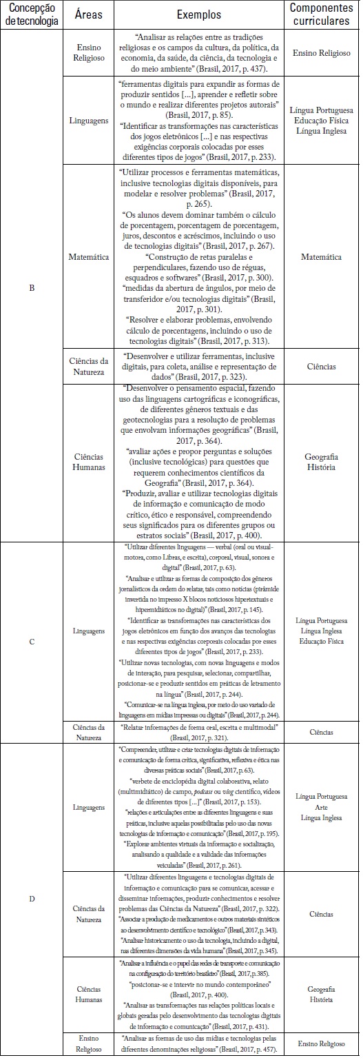 Os dados apresentados revelam a oscilação na concepção de tecnologias digitais. As áreas com maior diversidade de sentidos são Linguagens e Ciências da Natureza. Por exemplo, nas Ciências da Natureza as tecnologias são espaço (A) quando se postula: “Planejar e realizar atividades de campo [...]” (Brasil, 2017, p. 323); então se voltam para (B): “Desenvolver e utilizar ferramentas, inclusive digitais, para coleta, análise e representação de dados” (Brasil, 2017, p. 323); depois para (C), entendidas quando, entre a multimodalidade, contempla-se o digital: “Relatar informações de forma oral, escrita e multimodal” (Brasil, 2017, p. 321); e, por fim, (D): “Utilizar diferentes linguagens e tecnologias digitais de informação e comunicação para se comunicar, acessar e disseminar informações[...]” (Brasil, 2017, p. 322). As definições partem de um entendimento micro de tecnologia até alcançar o macro, que abarque a noção das múltiplas linguagens, em âmbito social.
