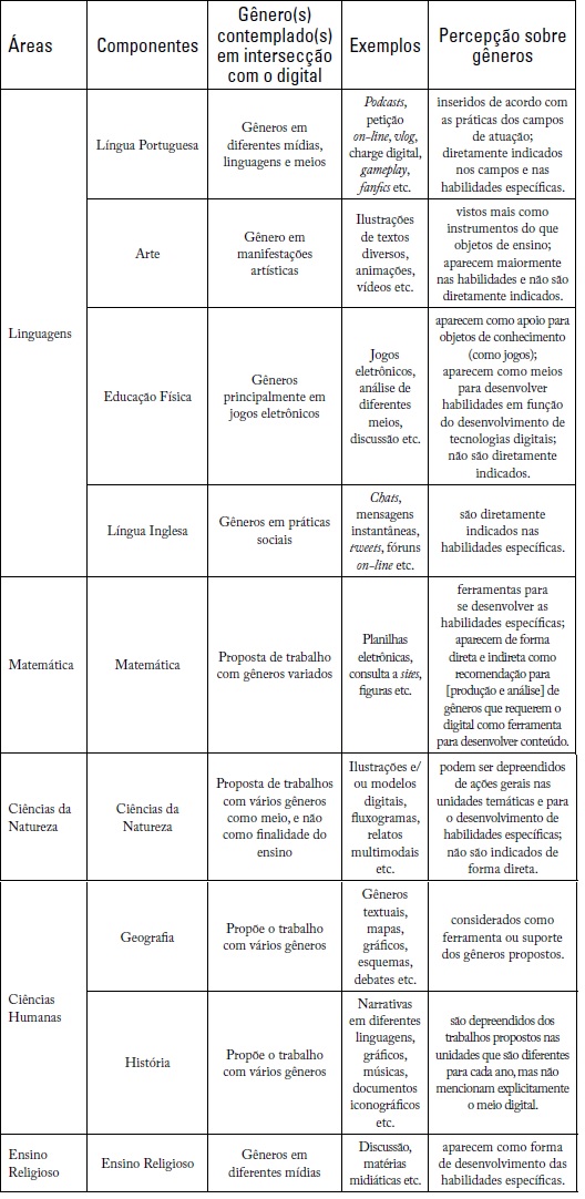 Os dados reforçam a ideia de que na BNCC as orientações nem sempre recaem no trabalho específico com gêneros em relação ao digital, os quais podem ser depreendidos pela maneira com que são contextualizados nas práticas e ações para se abordar objetos de ensino ou mesmo para desenvolver habilidades específicas, ainda que certos componentes façam questão de marcar essa relação, trazendo gêneros digitais - ver Língua Portuguesa e Língua Inglesa - ou que necessitam de ferramentas digitais para serem desenvolvidos, como se nota na Educação Física. Portanto, a forma como as tecnologias digitais são vistas e suas variações recaem na abordagem de gêneros discursivos em cada área/componente, isto é, como instrumentos, para determinadas ações, como no caso da Matemática, ou como meios de produção, no caso dos gêneros digitais em Línguas Portuguesa e Inglesa (Linguagens).